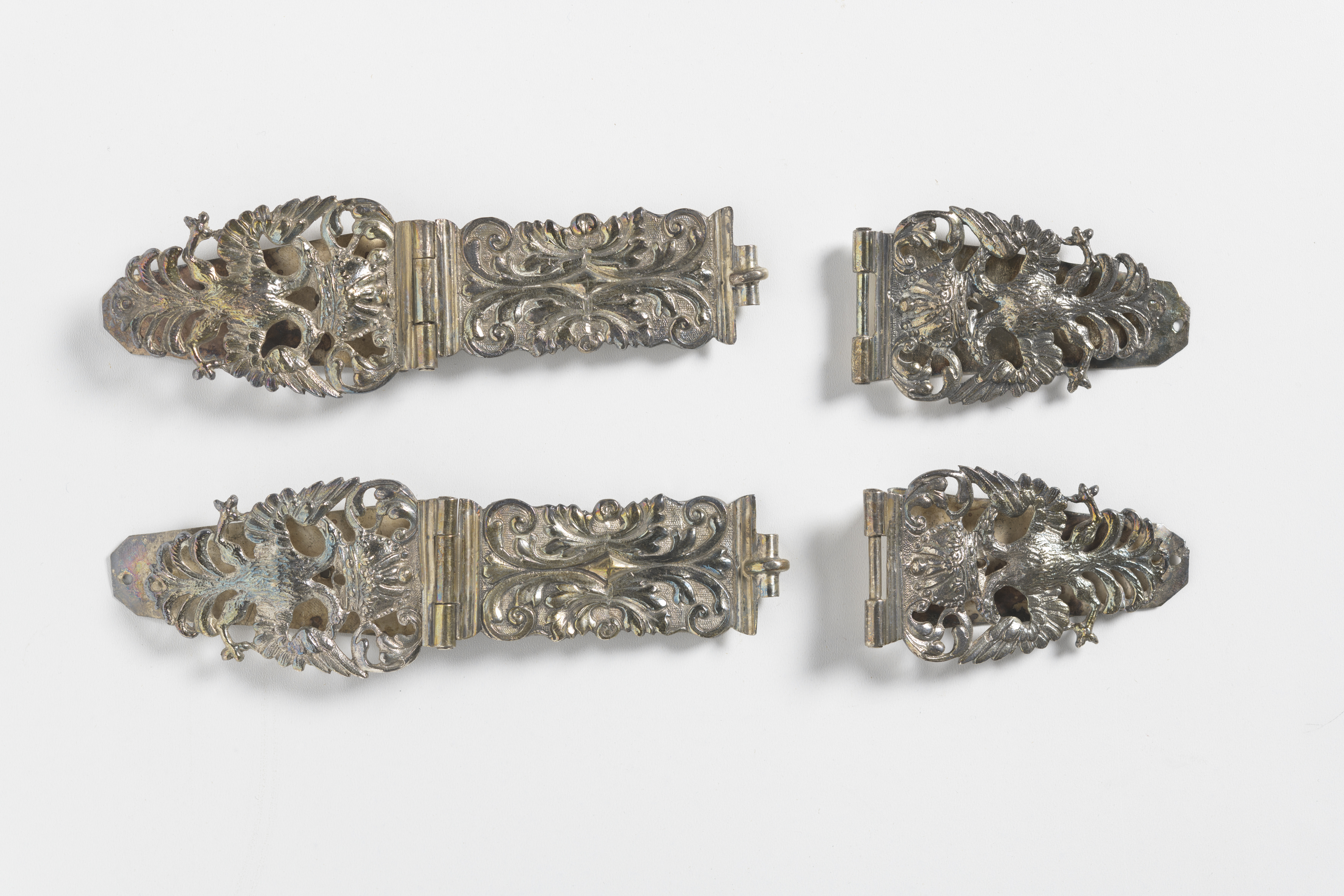 Title | veertien delen (8 hoekstukken voor- en achterzijde, 2 middenplaquettes, 2 delige klampen) zilverbeslag van missaalband |
